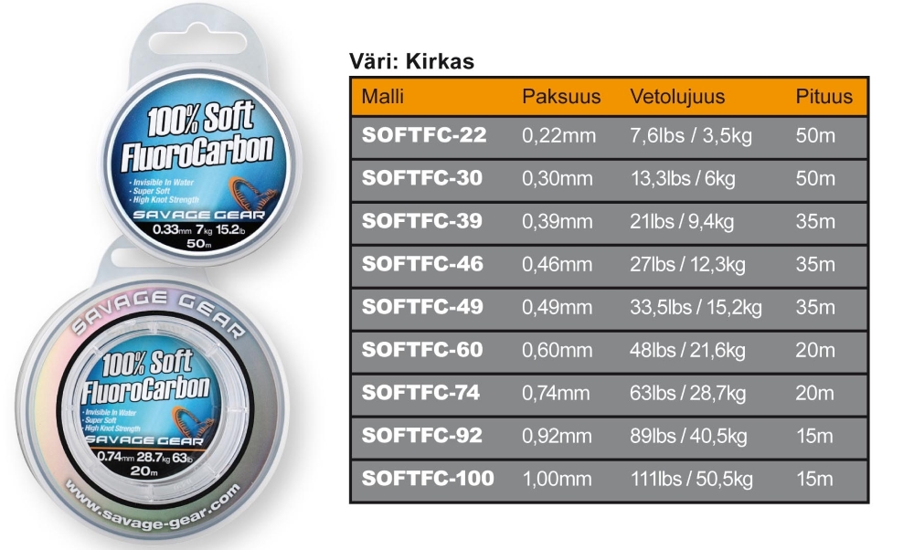 Savage Gear Soft Fluorocarbon är nästan helt osynlig för fisken. Fluorocarbon håller bra nötning och dess mjuka uppbyggnad begränsar inte betets gång. 100% Fluorocarbon är UV och kemikalieskyddad.