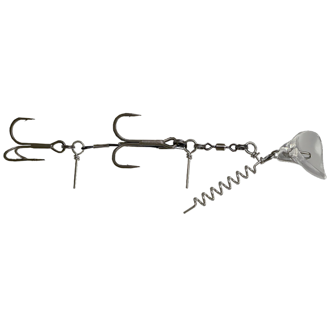 Headbanger färdig rigg med två trekrokar och sked. Vid normal och långsam gång ger skeden gäddgummit mer rörlig gång och när man stoppar svänger det ofta 90 grader åt sidan.