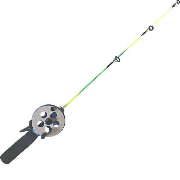 Finska Jonttu isfiskespö med 70 mm rulle, mittbroms, skumhandtag och 40 cm boosterspets med tre spöringar.