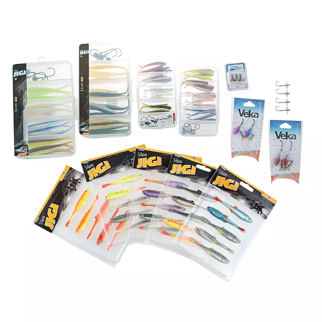 I hjärtat av paketet finns ett brett urval av VEKA V-Shad vertikala jiggar i 8 cm storlek. Det finns fem olika färgkombinationer, som täcker allt från naturliga nyanser till stimulerande färger. Dessutom innehåller setet fyra färdiga VEKA vertikala jiggset i två olika storlekar (55 mm och 100 mm), som erbjuder totalt dussintals utbytbara stjärtar och flera färdiga jigghuvuden.