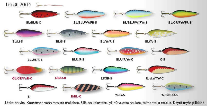 Kuusamo Lätkä 70/14 skeddraget är ett av Kuusamos äldsta modell bland beten. I över 40 år har det lurat gäddor, rödingar och övrig ädelfisk. Och passar för kastfiske som isfiske.