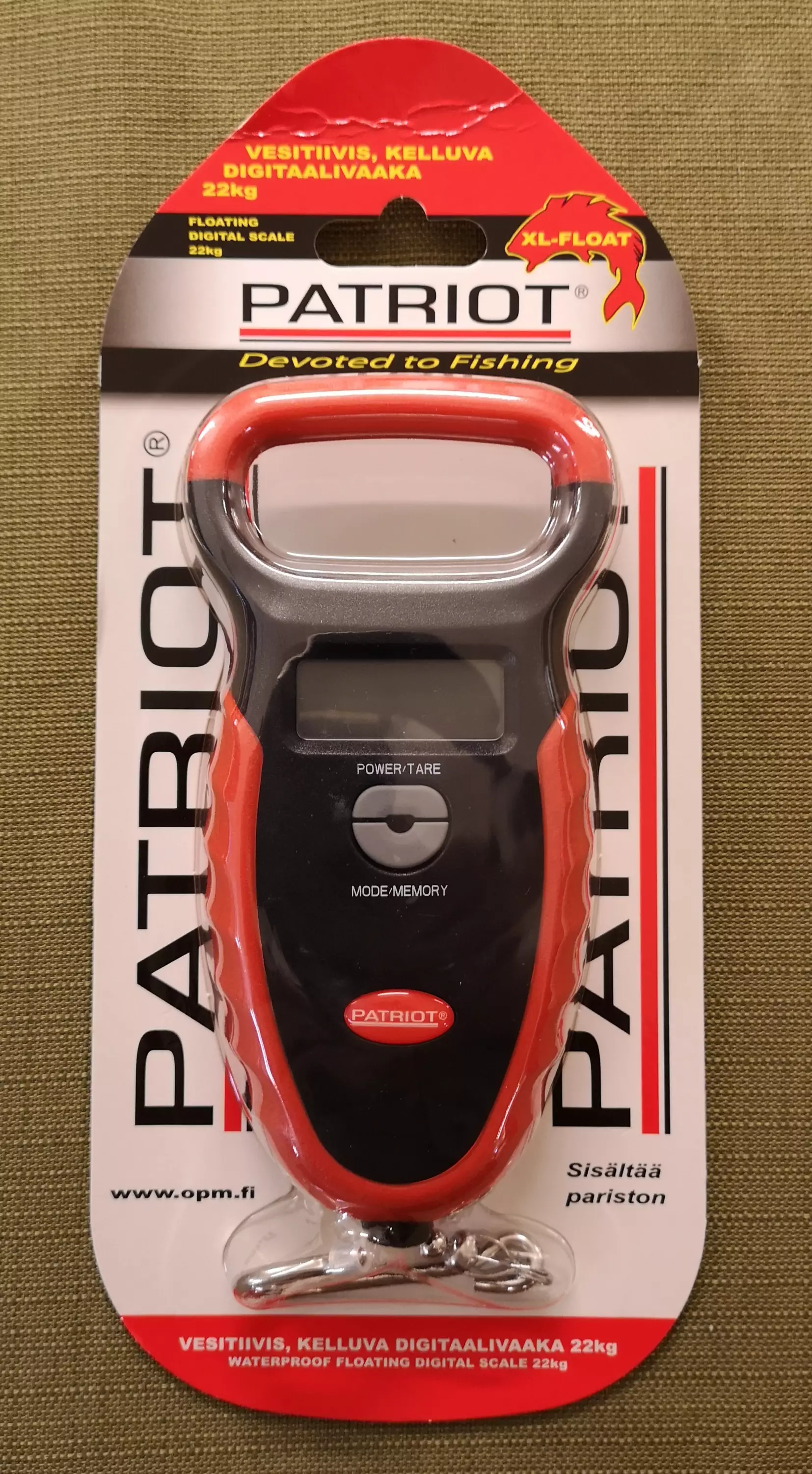 Patriot XL-Float flytande digitalvåg hållbar, flytande och noggrann fiskvåg! Vågens stomme är gummi som du också får bra grepp i våta förhållanden. Displayen är belyst, vilket gör att du kan avläsa den under den mörka tiden.