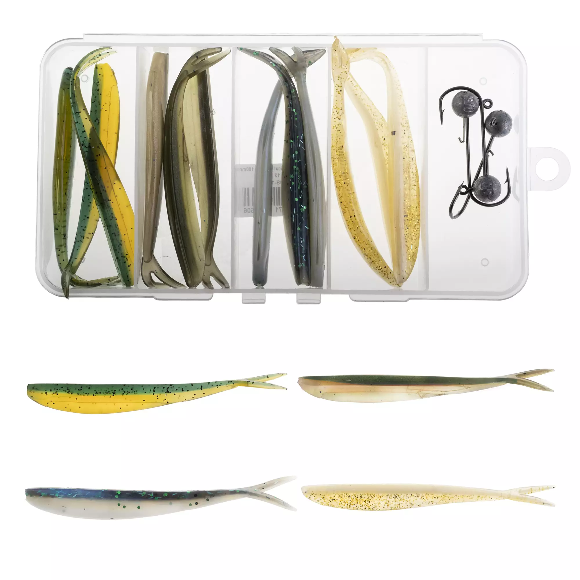 Veka jiggsortiment för vertikal jiggning av t.ex. gös. 5-fackslåda med 3 mikrojigghuvuden (7 g / #4/0) och 12 jiggar (3 x 4 färger: 10 cm).