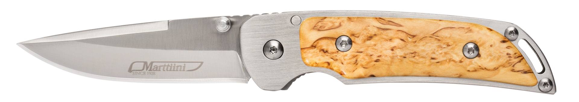 Marttiini Fällkniv MFK-CB Masurbjörk är en mågsidig fällkniv vildmarksbruk och allmänt bruk. Skaftet är tillverkat av vacker finsk masurbjörk. Bladet är tillverkat i japanskt rostfritt stål och behandlad satinyta. Bältes klämma på skaftet.