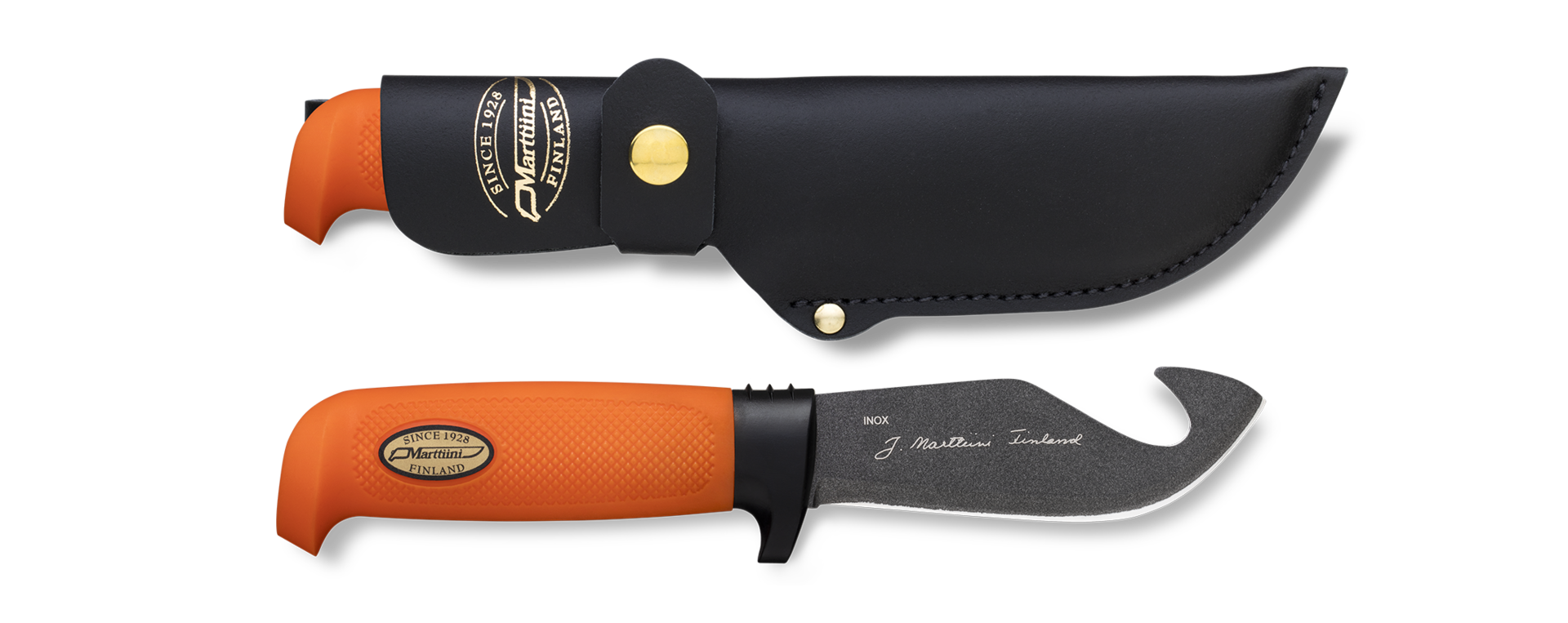 Hudkroken är ett utmärkt verktyg för att öppna djur. Kroken på baksidan av kniven hjälper till att öppna djuret utan att röra vid de inre organen, medan bladets runda form säkerställer att skinnet kommer bort rent och intakt. Kroken kan slipas med en penna-skärpare (som Marttiini-diamantspännaren).