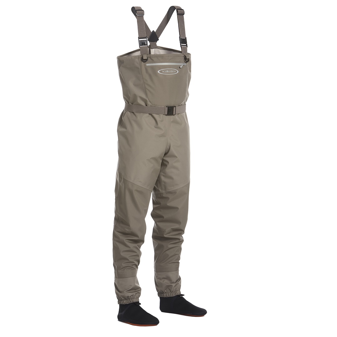 Detta är Visions mest prisvärda vadare, men den är fortfarande gjord av kvalitetsmaterial utan att göra avkall på viktiga detaljer. Byxorna är gjorda i en 3-lagers konstruktion och är mycket lätta. Byxorna har en ficka för värdesaker på insidan upptill, och en större ficka på utsidan av byxan som rymmer till exempel flugaskar. Byxorna har justerbara hängslen som är väldigt bekväma och ett bälte som byxorna sitter bra med och ser till att vatten inte kommer in i benen vid en olycka.