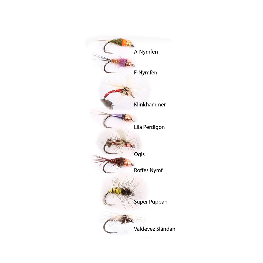 - Flugor: A-Nymfen #14, F-Nymfen #14, Klinkhammer #16, Lila Perdigon #14, Ogis #14, Roffes Nymf #14, Super pupa #14, Valdevez Sländan #16