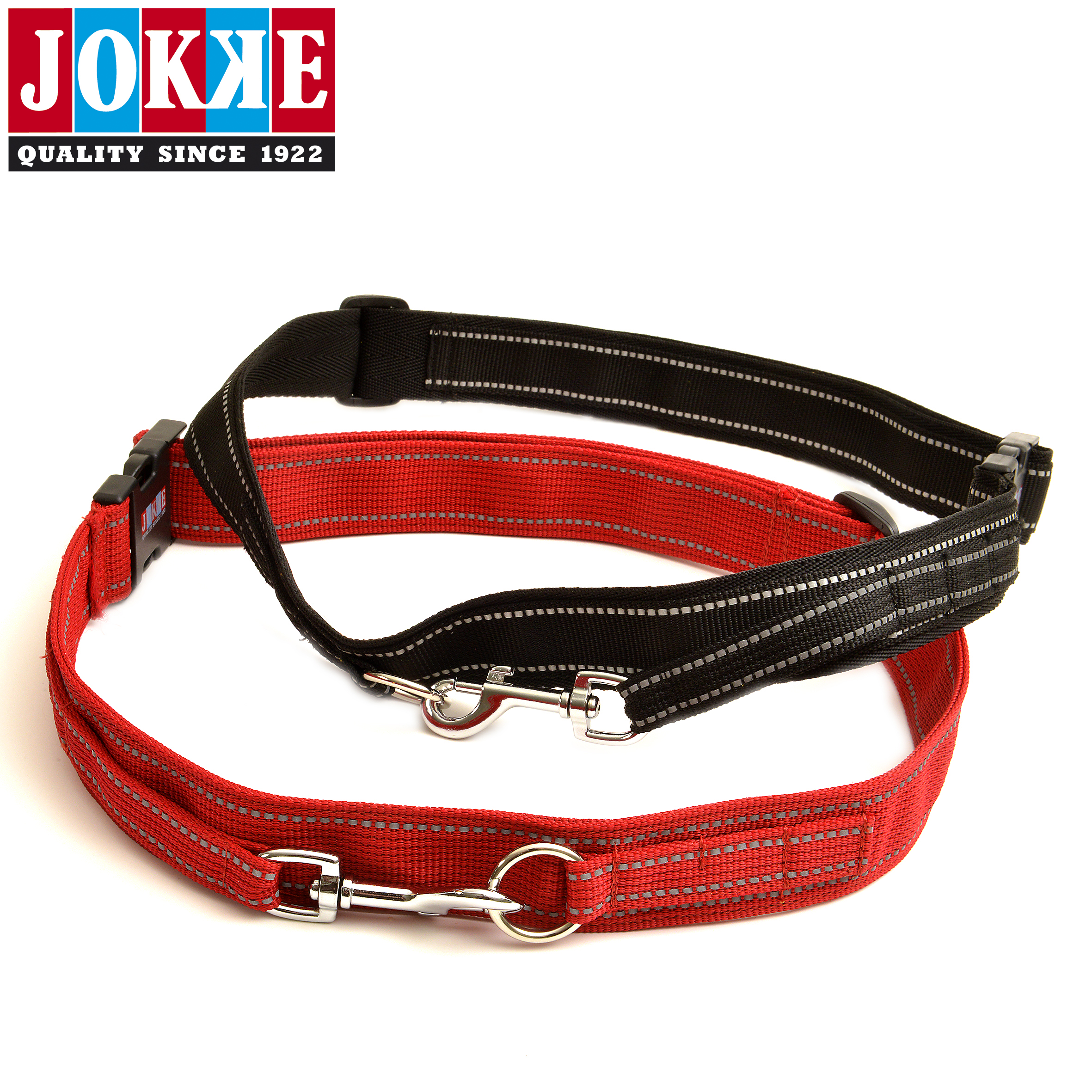 Tsokka svart eller rött gångbälte med 40 mm reflexband, inställningsområde 85 -120 cm, möjlighet att fästa flex koppel. Bekvämt justerbara gångbältet.