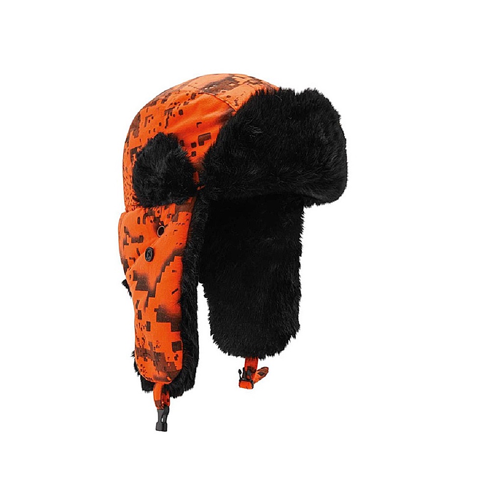 Swedteam Pilotcap Desolve Fire -pälsmössa är en varm fodrad med mjuk och varm fuskpäls, som till exempel är perfekt för älgjakt! Det orange Desolve Fire digitala mönstret fyller helt signalfärgen enligt lag och är därför perfekt för sälskapsjakter. Tack vare Digicamo passar mössan bra även i kallt väder på alla jakter, till exempel för toppjakt. Öronlapparna har fästklämmor som gör att du kan fästa antingen under hakan eller upp på mössan.