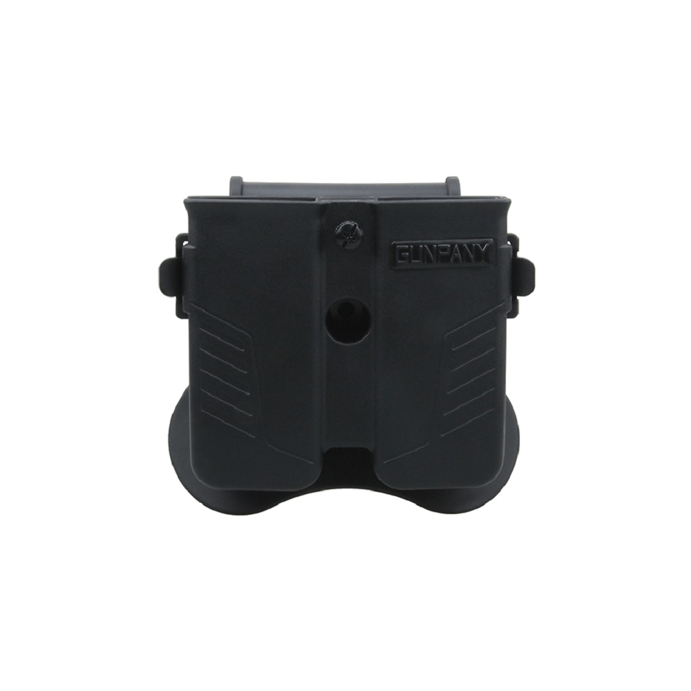 Universell pistolmagasin kompatibilitet med 9 mm .40, .45, enkel eller dubbel magasin. Tillverkad av plastpolymer, justerbar spänning, mattsvart.
