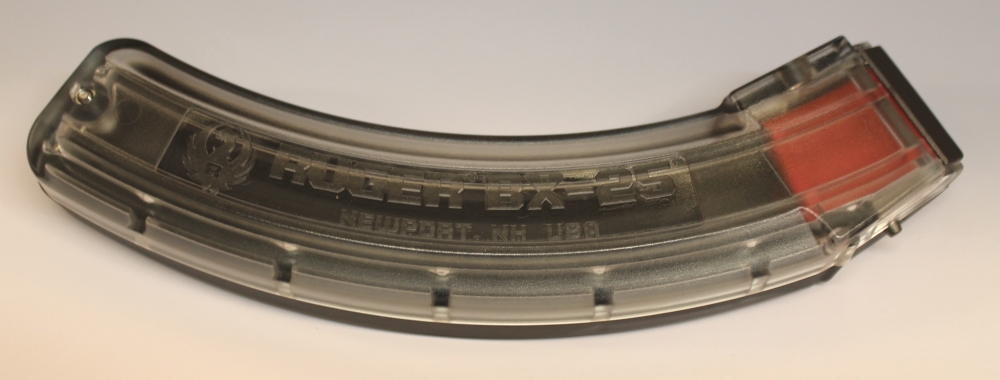 Är ett magasin för 25 patroner lämplig för Ruger 10/22 slongsgevär. Den andra sidan av magasinet är gjord av klar plast, vilket gör det lättare att kontrollera patronens situation.
